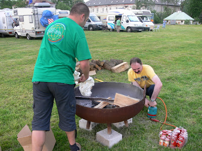 miejsce na ognisko. Pomagali w ustawianiu pierwszych przyczep i